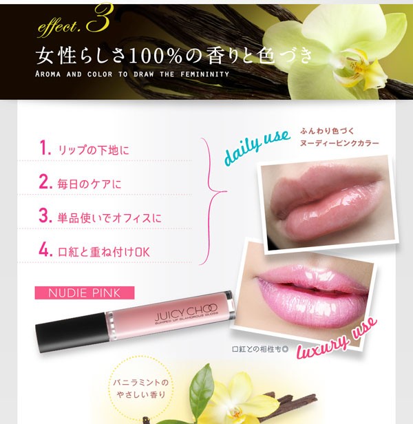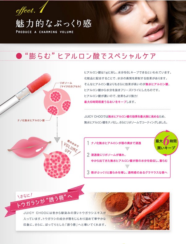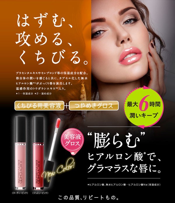 ヒアルロン酸をフリーズドライにした無水ヒアルロン酸を配合。グロスを塗ると、唇の水分を吸収してヒアルロン酸が‘ぷくっと’膨らみ、唇全体をぷっくりさせます。また、プラセンタエキスやスクワラン、セレブロシド等の美容成分も配合し、異性を惹き付ける唇を演出。ヌーディーピンクと違い、塗った時にほんのり色付くタイプが新発売。