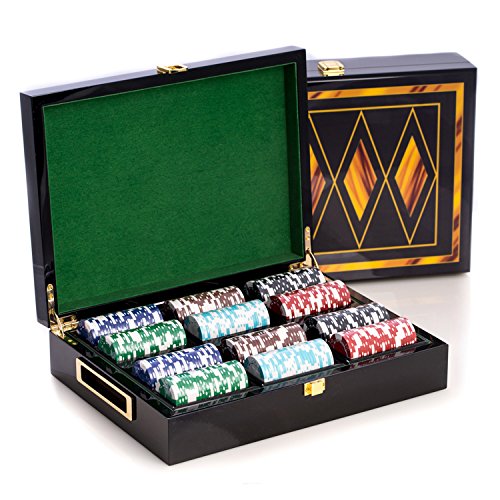 Studio : Kensington Row Collection Publisher : Kensington Row Collection Binding : Kitchen Product Description Our handsome poker set makes a great executive gift. Presented in a handsome lacquer wood box inlaid with a multi-diamond motif on top, our deluxe set includes 300 - 11.5 gram clay composite chips, two decks of playing cards 5 poker dice. Measures approximately: 13.25"W x 10" D x 3.25"H. 0
