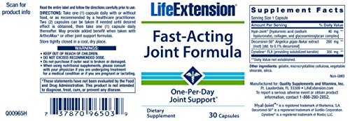 Life Extension's Fast Acting Joint Formula includes novel joint health nutrients that can be used as a standalone joint health formula or as a complement to other Life Extension bone health formulas such as ArthroMax? with FruiteX B®. Designed to help maintain the healthy function of the articular cartilage, the sturdy yet elastic tissue that covers the ends of bones in joints to facilitate smooth movement, Fast Acting Joint Formula contains patented forms of hyaluronic acid and keratin, and a novel plant extract Angelica gigas Nakai. Hyaluronic acid (HA) is a glycosaminoglycan (similar in many ways to glucosamine and chondroitin) that is widely distributed throughout many connective tissues (cartilage, bones, muscles tendons, ligaments, and skin). It is one of the chief components of the extracellular matrix (such as synovial fluid in joints) and contributes significantly to connective tissue integrity. Hyaluronic acid serves as one of the primary lubrication components for healthy joint cartilage, where it can help maintain normal joint function by increasing the viscosity of the synovial fluid and by making the cartilage between bones more elastic and smooth-moving.Feature