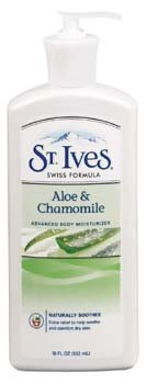 -. Binding : Misc. -. Brand : ST IVES SWISS FORMULA -. EAN : 0077043103258 -. Feature : ALOE & CHAMOMILE. / ADVANCED BODY MOISTURIZER. / THIS PRODUCT WAS NOT TESTED ON ANIMALS. -. Label : ALBERTO-CULVER COMPANY -. Manufacturer : ALBERTO-CULVER COMPANY -. PackageQuantity : 6 -. ProductGroup : Beauty -. ProductTypeName : BEAUTY -. Publisher : ALBERTO-CULVER COMPANY -. Studio : ALBERTO-CULVER COMPANY -. Title : St. Ives Aloe & Chamomile Advanced Body Moisturizer 18 oz (Pack of 6) -. UPC : 077043103258