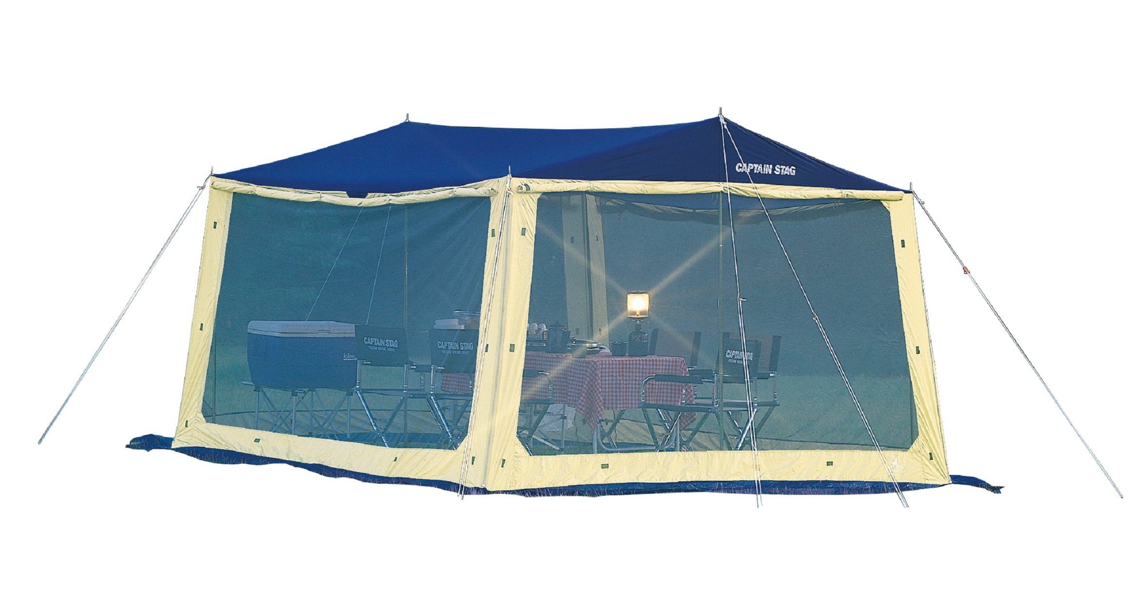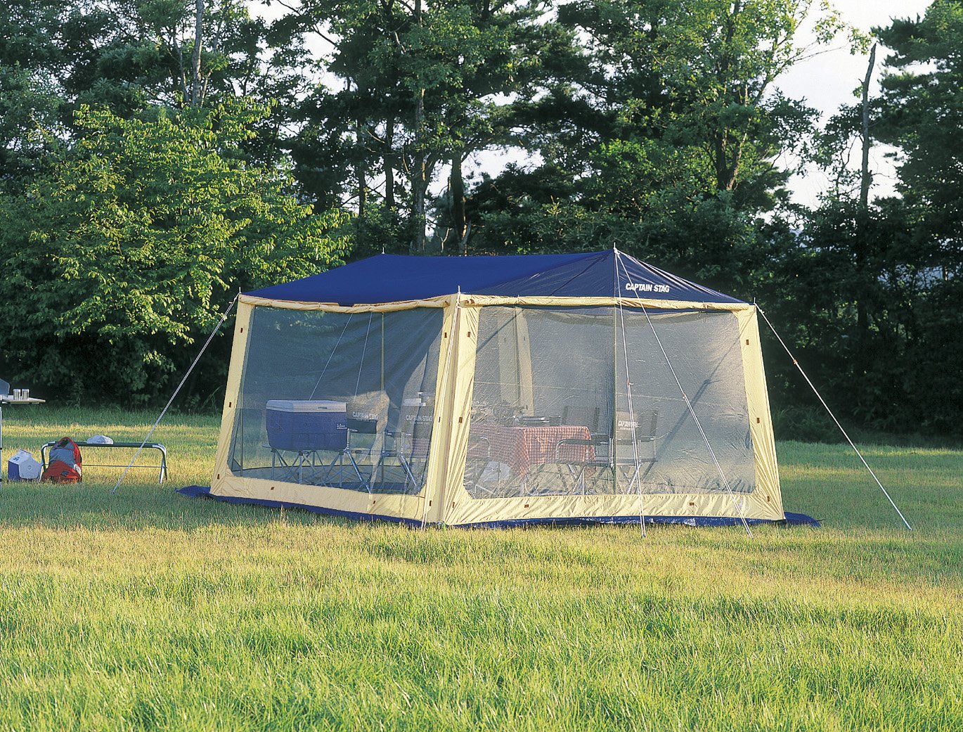 A mesh tap with 1 mm mesh on the whole that prevents sunlight and insect invasion by superior breathability is equipped with a screen panel to prevent rain and wind all over and secure a comfortable living space for 4 to 5 people