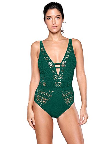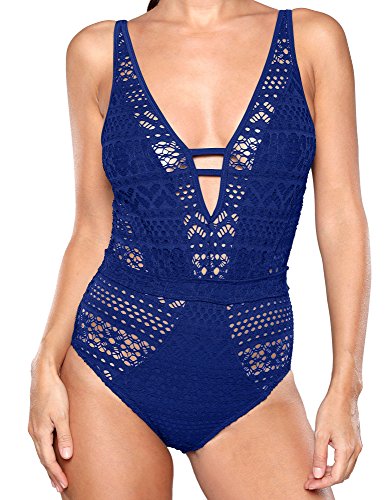 Its adjustable straps ensure a perfect fit. Lace crochet adds a classy touch to the classic one piece bathing suit.