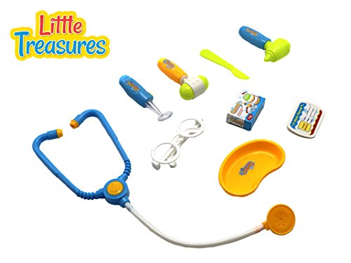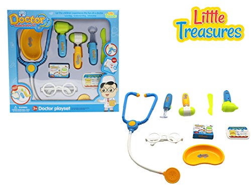 Studio : LITTLE TREASURES Publisher : LITTLE TREASURES Binding : Toy Product Description The interesting playset clearly shows a bunch of interesting instruments; real like toy stethoscope, lancet, goggles, waste dish and an otoscope set for effective diagnosis on the go. Doctor medical playset is primarily to be used to experience the medical occupation and save immense lives using the toy tools provided. A unique learning objective is evident in this game let your child be aware of medical principles and complications along with the instruments in his hands. Little treasures has introduced specific products to the market that are extremely educational in their themes, and privately labelled with an objective behind each. Doctor medical playset is ideal for 3 children and is thoroughly entertaining with more than 2 players. yet we provide hassle-free return in other cases. This toy set is a fun and entertaining game with a lot of potential to make awesome heroic stories. Unlike majority of the games that come today for the kids, the toy cares for the intellectual growth of your little person; the game subtly boosts their motor skills, cognitive reasoning, and spatial awareness. Brilliant color Usages, animated tones and eloquent construction of the game brings up the spirit in the children to make most of the colored pieces, since they appeal to their tiny minds. A dramatic effect to the toy is added to push up their impulsive nature, put a sparkle in those adorable eyes and stimulate their motor skills such that they make unsuggested effort, and learn. The more than one player tactic of this playset allow a fun time to be spent between the child and parents, who can allow the little ones to do all kinds of tricks on them while simultaneously learn the correct spelling and pronunciation of the complex words of the tools. It's a many in one package, after all!. 0