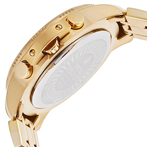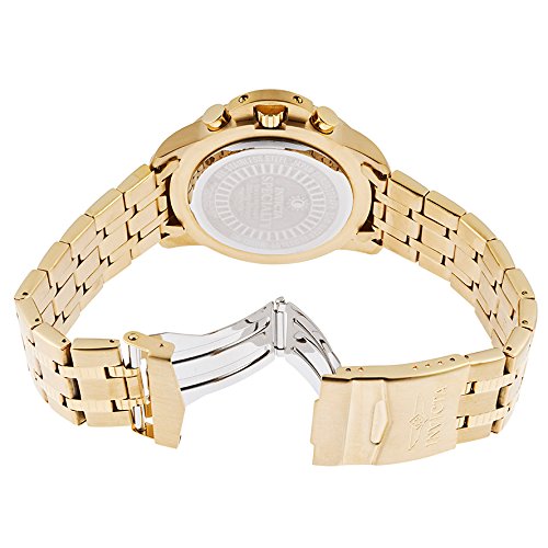 Invicta's Specialty series has a motto that proudly states 'making history.' You'll also be making a huge fashion and style statement with this brilliant 18k gold-plated stainless steel timepiece. Three subdials sit on the gold-tone dial and they reveal 60-second, 60-minute and 24-hour increments. Luminous Arabic numerals and indices make for easy time telling, and the dial also acts as a tachymeter. With a bold 48mm case and shiny bracelet, it's the ideal addition to any man's watch collection.Feature