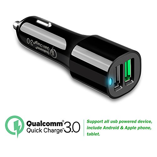 -. Feature : Build in Qualcomm Quick Charge 3.0 technology, 4X Charing Speed than Conventional Charger. Easy identify your Quick charge 3.0 Device. / Dual USB Port, Convenient Charging Your Phone/Tablet/Laptop at same time. The QC3.0 Port Output 18W, Up to 3Amp, Conventional Charging Port: Output 12W,5V=2.4Amp.Total Output: 30W. / Universal Compatibility: Both Android & Apple Phone/Tablet Charging Available. Compatible with: Ipad Pro,Ipad air, Ipad Mini, ipod,Apple iphone X 8/8Plus/7Plus/7/6/6 Plus/6 Splus, Samsung Galxy S8 Active/S8/S8+ Plus, Note 8,Samsung J7 P.R.Ime/Pro and More. / Premium Quality Qualcomm Certified/Safety With UL Listed. Approved by Underwriter Laboratories. Also with FCC/CE/RHOS Certified. / Package Include: 1x Dual Port Quick Charge Car Charger