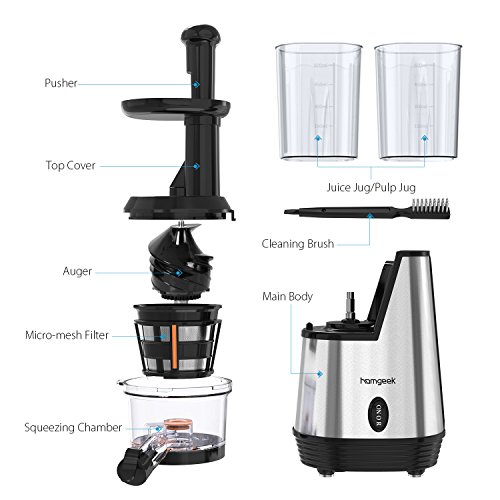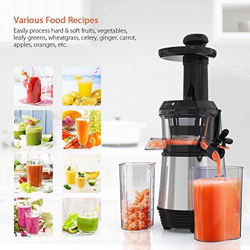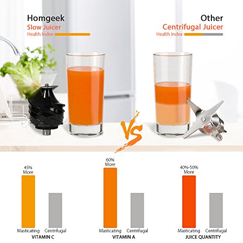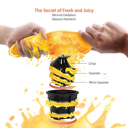 1.✔ Higher Nutrition - A masticating juicer extractor juices at low speeds of 70 RPM minimizing heat build-up and oxidation. This gentle squeezing action keeps minimal Oxidation, low heat build-up, less foaming and no clogging, remains much more enzymes, vitamins, minerals and trace minerals when use juicer. Less nutrients lost. More Healthier.
