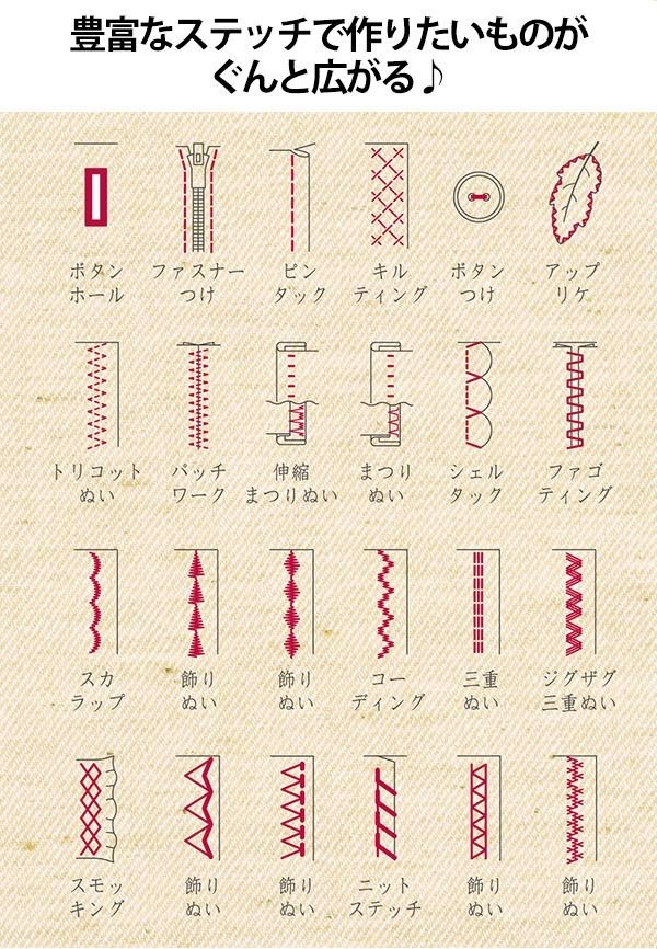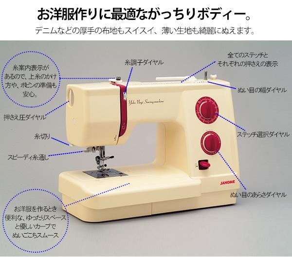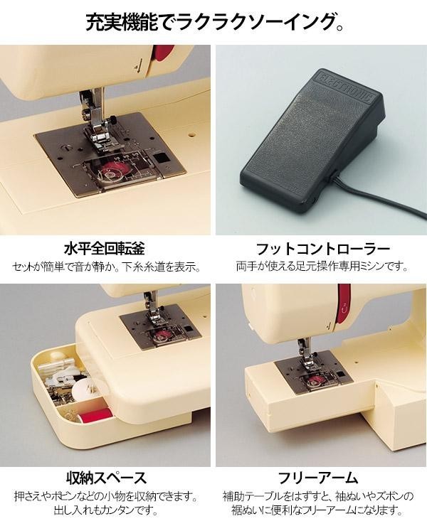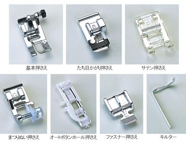 | 付属品 | 基本押さえ、たち目かがり押さえ、ファスナー押さえ、サテン押さえ、まつりぬい押さえ、ボタンホール押さえ、キルター、針、針ケース、ボビン、ドライバー、ミシンブラシ、シームリッパー、補助糸立て棒、糸こま押さえ(大)、糸こま押さえ(小)、フェルト、フットコントローラー、早見板(ソーイングガイド)、取扱説明書、保証書(保証期間1年) |