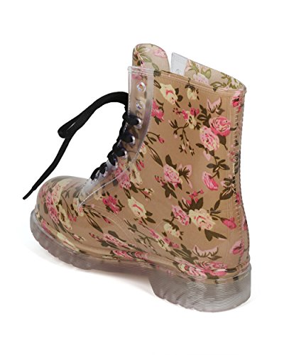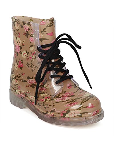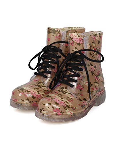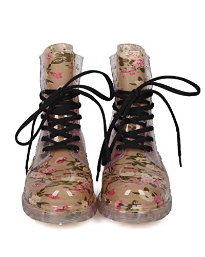 Alrisco Women Floral PVC Lace Up Lug Sole Combat Rain Bootie - HF93 by Red Ruby Collection