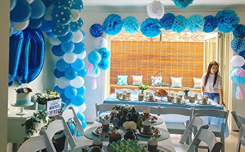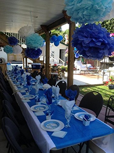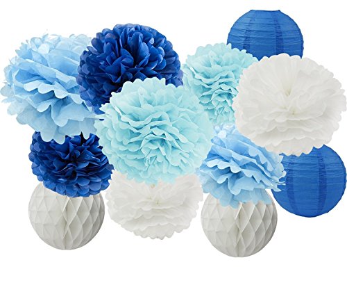 Pack list: 2 pcs 8inch navy blue paper lanterns;2pcs 8inch white honeycomb balls; 8pcs tissue pom poms:4pcs in 10ich:1*white+1*navy blue+1*baby blue+1* turquoise blue and 4pcs in 12ich:1*white+1*navy blue+1*baby blue+1* turquoise blue.
