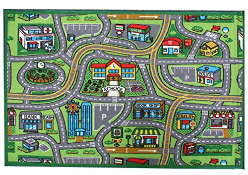 The 40 inch by 60 inch Street Map rug allows children to discover their own creativity, individuality and power of imagination, while having lots of fun in this make believe town. With many places to go, this is a learning rug that teaches about town life including the location of the bank, Hospital, school and places to Eat. Great for all ages! This children's rug uses familiar locations, roads, and signs to promote learning basic map concepts and enhancing play time! This street map and city scene rug is a cheerful addition to any children's learning environment. This 40 inch by 60 inch decorative rug with its natural calming colors provides a perfect, cozy space for playing, toddling, and learning. This kids play rug is the perfect playful accessory for any child's room or play area, functioning as decor, a learning rug, educational rug, play rug, and all around fun rug! Young children who are learning or interested in the city will enjoy this colorful rug. This rug features a street map theme covering interstates, roads, school, stores, hospital, bus stations, police departments, book stores, bakery, restuarants, banks, parks and more! These bright colors include blue, yellow, green, red, orange, pink, and purple. Bring the fun indoors, no messy chalk or hard cement required outside! Not only will this bring joy and entertainment to kids, this rug is a great way to teach you children about important landmarks too. It will be easy learning and lots of fun. Constructed from high quality nylon fibers with a latex gel non-skid / skid-proof backing, the learning rugs are built for longevity, safety, to stay in place, and for lots of fun. For care, machine wash using mild soap and cold water. Childrens play rug learning carpets are available in 4 designs - Alphabet, Numbers, Street Map, Town Fun. Educational rug measures 40" X 60".Feature