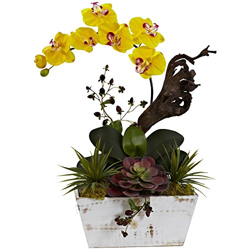 Nearly Natural 1458-YL Orchid & Succulent Garden with White Wash Planter