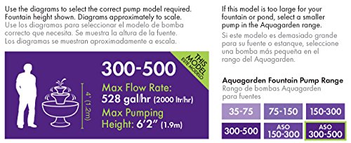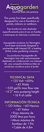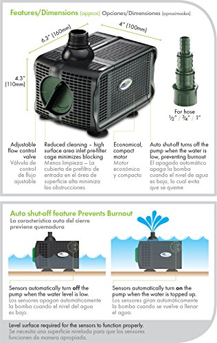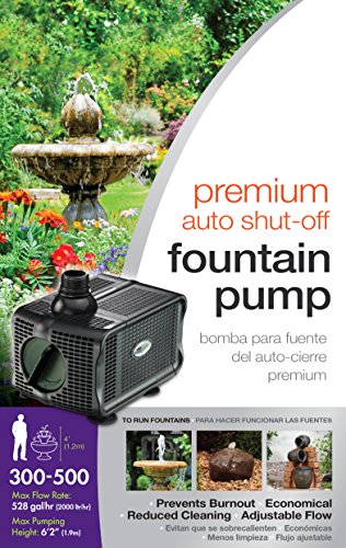 The Aqua garden Auto Shut Off Fountain Pump has been designed for use in fountains or ponds, either indoors or outdoors. The Auto Shut-off feature of this pump recognizes when the water level in your fountain drops too low. This prevents the pump running dry, overheating and ‘burning out’. The economical, compact design pumps water around your water fountain and the adjustable flow control gives you the flexibility to change the height and speed of the water. The high surface area inlet pre-filter cover is designed to minimize blocking and reduces cleaning frequency so you can spend more time enjoying your attractive water fountain. Includes: Fountain Pump (120 Volt, 60Hz, 42 Watts, 528 gal/hr. maximum flow, 6’2” maximum pumping height and 16’ cable) and a hose fitting to fit –½”, ¾” & 1”.Feature