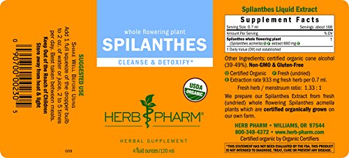 ReleaseDate : 2013-09-25 Studio : Herb Pharm Publisher : Herb Pharm Binding : Health and Beauty Product Description Get cleansing and detoxifying support with Spilanthes liquid extract from Herb Pharm. We prepare our Spilanthes Extract from the fresh (undried) flowering herb root of Spilanthes acmella plants which are Certified Organically Grown on our own farm. To assure optimal extraction of Spilanthes' bioactive compounds, the plants are hand-harvested only when in full-flower, and are then taken directly to our laboratory and promptly extracted while still fresh and succulent. 0