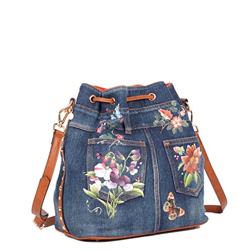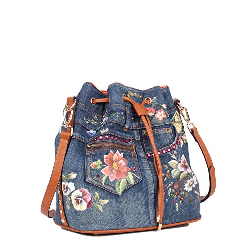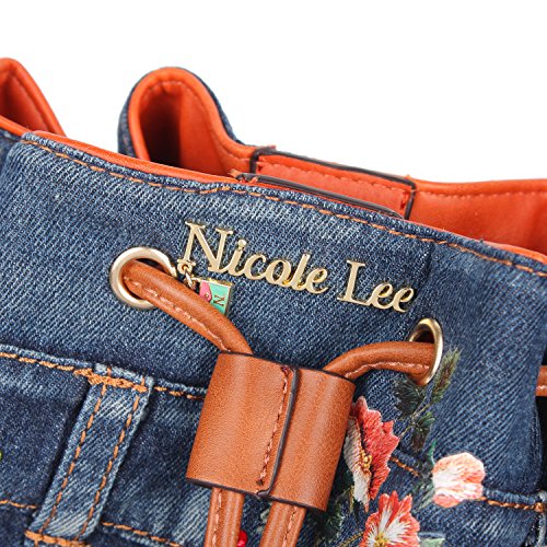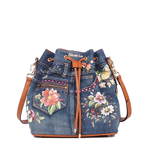 Product Description A busy day awaits, take style with you carrying this Nicole Lee Cassia Denim Flower Bucket Bag. Exterior Features: Made of denim with hotpress floral design, rhinestone and stud embellishments. Threaded drawstring top. Detachable shoulder strap. Vegan leather reinforced bottom. Structured silhouette. Protective metal foot base. NL gold-tone signature at front. Interior Features: Large open compartment with zip wall pocket with NL nameplate at back, vegan leather key chain strap, double open wall pockets at front and NL stripe logo nylon lining. Includes adjustable and detachable 44" - 53" inch shoulder strap. Colors available are Denim Flower. For cleaning, wipe with damp cloth. 0