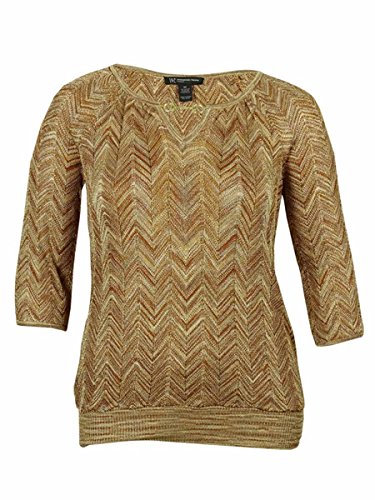 This chic sweater features a split neck with a gold clasp, three-quarter sleeves, and metallic material.