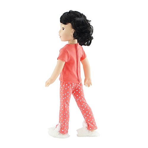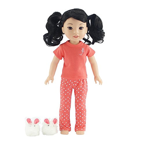 -. Feature : Made to fit 14 Inch dolls such as American Girl Wellie Wishers, Hearts For Hearts Girls, and similarly sized dolls. / Gift-Boxed! Packaged in classy pink gift box with Emily Rose logo. / Your 14" doll will be comfy and ready for bed in these coral colored polka dot pajamas, including elastic waist pants for easy dressing and matching t-shirt with Emily Rose logo. / The soft 2 piece polka dot doll pajama outfit comes with a cute and fluffy pair of white bunny slippers, perfect for sleepovers! / Designed and manufactured by Emily Rose Doll ClothesTM. Luxurious high quality fabrics, hand washable, safety tested.