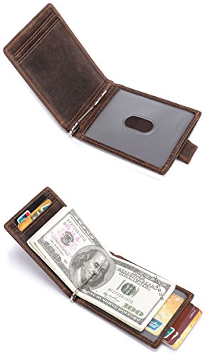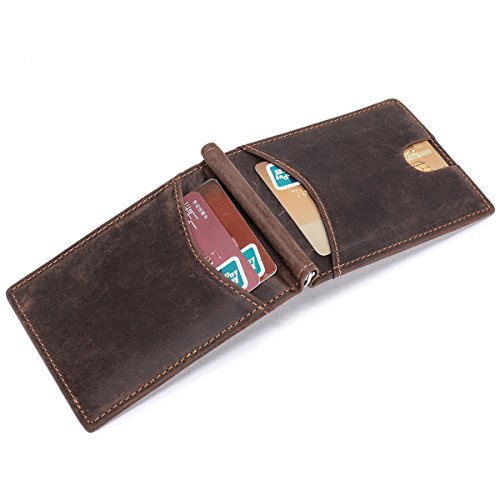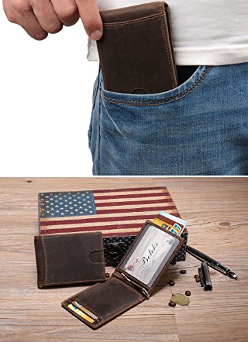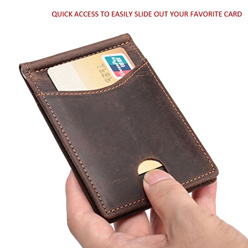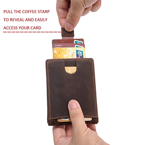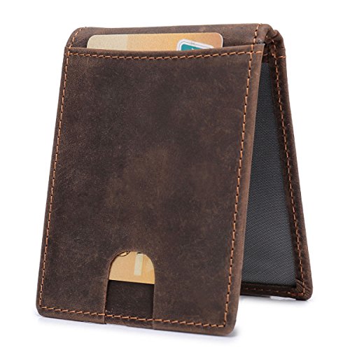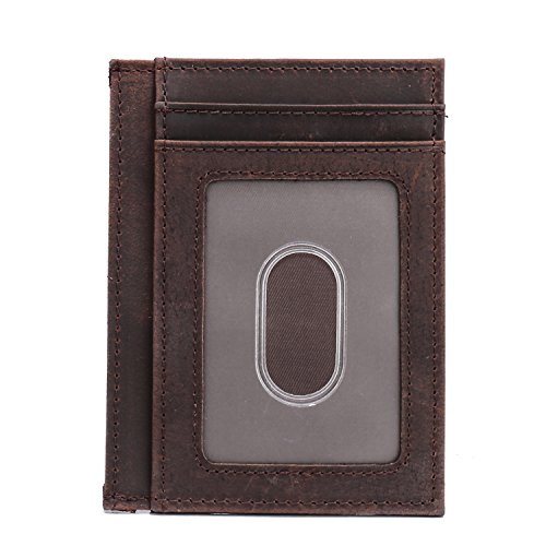 -. Feature : COWHIDE GENUINE LEATHER - Made with the Finest Full Grain crazy horse genuine leather, which feels luxury, vintage,sofer and looks even better after using for a long time.Wallet Size:3.93x3.15x0.40 in. / ULTRA SLIM & MINIMALIST - Designed Quick Access Slots to easily slide out the card from their sleeve.Including card retrieval pull-tab that displays all of your grouping of credit cards in the side slot.Holds up to 6 to 10 cards plus US bills with no bulk / SAFETY & P.R.IVACY - Equipped with advanced unique RFID Blocking Technology, engineered specifically to prevent your valuable personal information from unauthorized scans. / DURABLE & COMPACT - Every slot was lined with slippery rfid blocking material, which allows your cards to slide in and out of the pockets easily,fits perfectly in your front and back pocket with room to spare. / PLEASE BE NOTED: This is genuine leather products, it usually come with the leather smell and it'll fade out as time going.This kind of leather is easy to get scratches on the surface, please understand.Thanks. If you're not completely satisfied with our RFID Blocking Wallet,please contact us directly and we'll refund your purchase or send you a replacement.