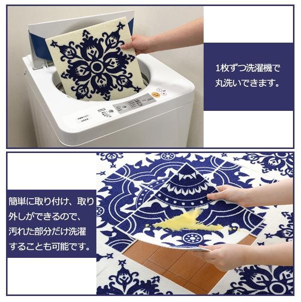 | 裏面が床にピタッと吸着する北欧デザインのタイルマットです。大柄と小柄の組み合わせで、いろいろな表情にアレンジできます。厚さ4mmという薄さでつまずきにくく、扉の開閉の妨げにもなりません。ハサミでカットすることもでき、スペースに合わせて自由に組み合わせて敷いていただけます。掃除機をかけても吸いあがらず、楽にお掃除できます!!汚れた部分だけ洗濯もOK♪ |