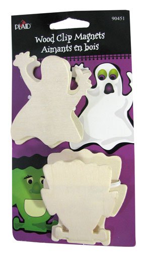 Studio : Plaid Publisher : Plaid Binding : Toy Product Description Our unfinished wooden clips will work anywhere a spring-loaded clothespin works, and have a 1" rubber disc magnet on the back for sticking them to the fridge or file cabinet. The surface is light pine with an area of approx 1" x 3" for your added art. Clip a photo, a grocery list or a bag o' chips. You pick the Frankenstein head/ghost pair or the gravestone/skull crossbones pair. For a DIY Halloween. You'll get (6) clips. 0