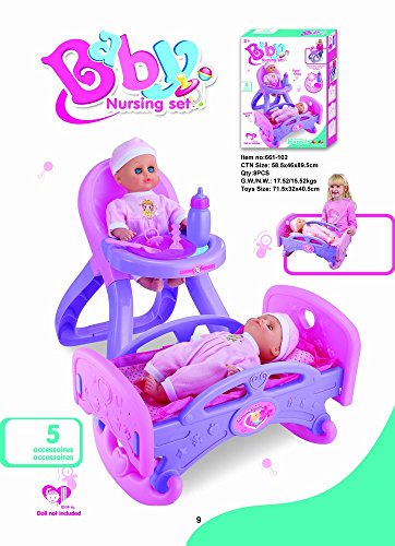 The MeeYum 2 in 1 Nursing Playset Includes everything you need to properly care for your doll! Your little ones will love to rock their beloved dolls to sleep in this fabulous rocking bed and feed them in the realistic looking feed chair with real time accessories.Feature