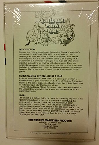 Studio : Interpretive MarketingProducts Publisher : Interpretive MarketingProducts Binding : Toy Product Description 1988 National Park Wit Card Game / Factory Set Bonus Civil War Game , 108 beautiful full color photographs in each game total of 216 colors photos , Two informative, educational, and fun discovery games , Great for family fun!! Bonus inside : official guide and map of national parks of the United States , Produced by Interpretive Marketing Products 0
