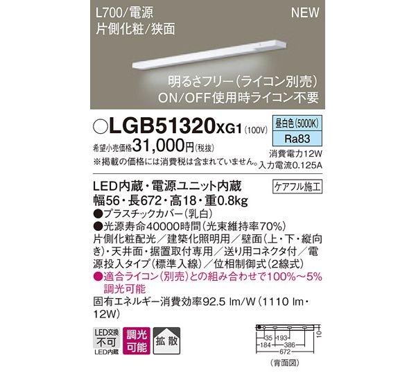●光源:LED(内蔵、昼白色タイプ)、色温度:5000K、光源寿命40000時間(光束維持率70%)