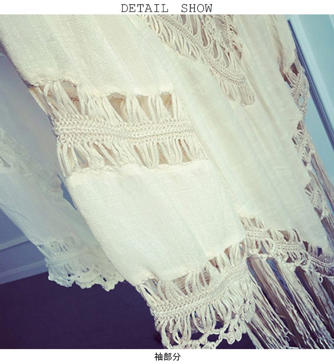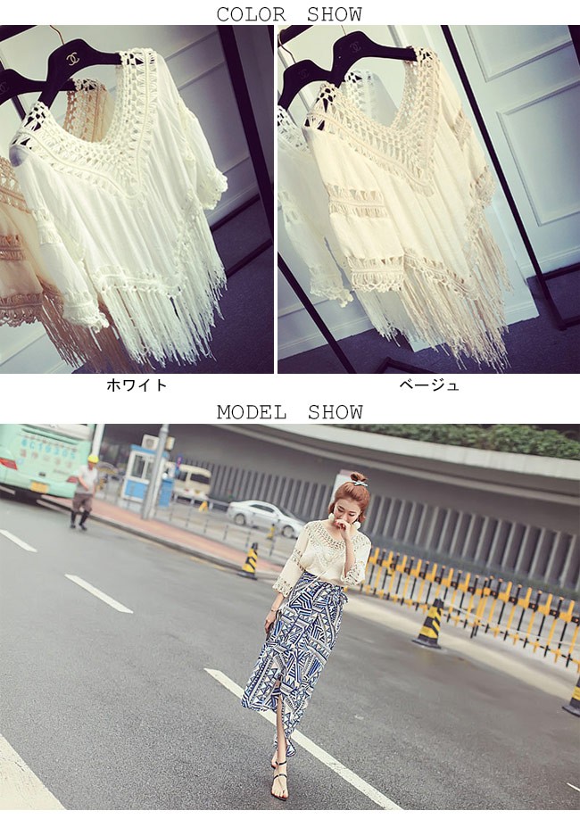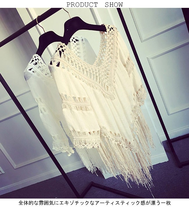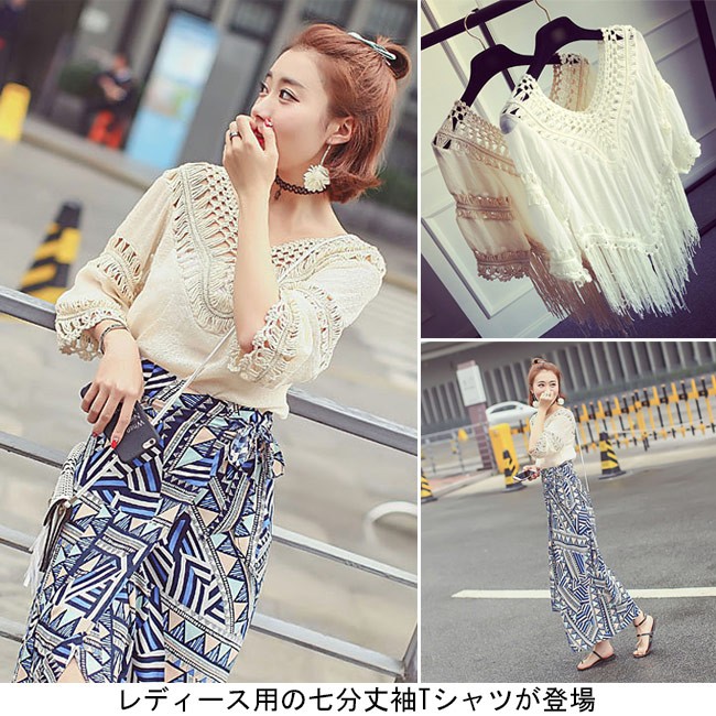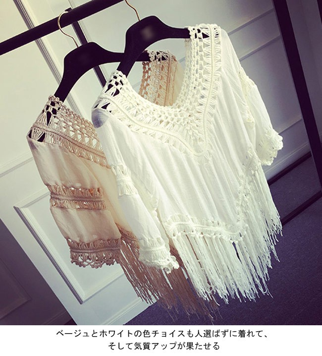 Tシャツ 七分丈袖 ゆったり レディース ボヘミアン Vネック フリンジ 透かし彫り 女性用 トップス 夏物 春秋物 エスニック エキゾチックレディース用の七分丈袖Tシャツが登場大きめのVネックは綺麗な鎖骨部分を強調、女性ならではの優雅な色気を醸し出す美しい透かし彫りのデザインで情熱的なボヘミアン風ファッションを演出不規則裾に長めのフリンジが付き、甘くてフェミニンなアクセントを付ける全体的な雰囲気にエキゾチックなアーティスティック感が漂う一枚ベージュとホワイトの色チョイスも人選ばずに着れて、そして気質アップが果たせるカラー:ホワイト ベージュ素材 ポリエステルサイズ(cm) S M LS バスト90 着丈(フリンジ含み)75M バスト96 着丈(フリンジ含み)75L バスト102 着丈(フリンジ含み)75ご注意:※サイズは平置きサイズです。素人採寸ですので、若干の誤差がございます、ご了承ください。
