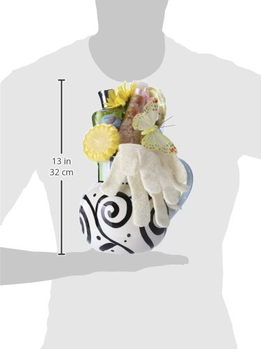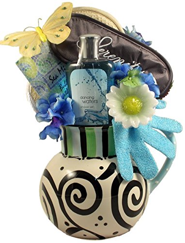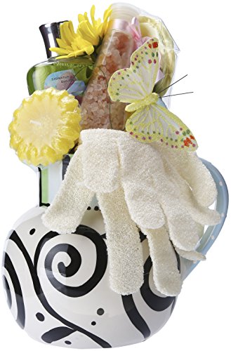 This absolutely stunning gift features a "Lowden field" ceramic pitcher with a unique hand painted floral design with bird. This beautiful piece arrives filled with an Egyptian cotton hand towel, vanilla caramel scented hand and body lotion, Zen bath salt, a mesh body sponge, a relaxation spa cd, an exfoliating bath mitt, and to make this gift even sweeter, we have added gourmet caramel candies. Adorned with a keepsake bird pick, designer ribbon and silk flower, this is a perfect gift choice for any occasion. This is a very special gift and whoever you send it to will treasure the pitcher for years to come.Feature