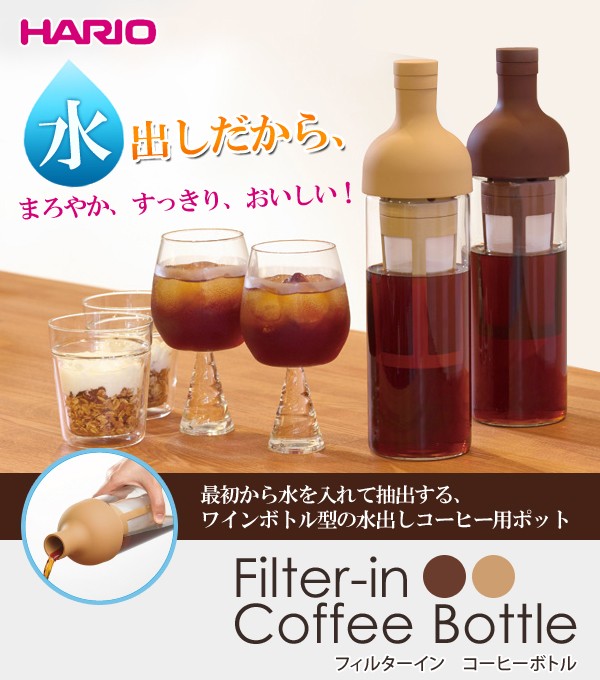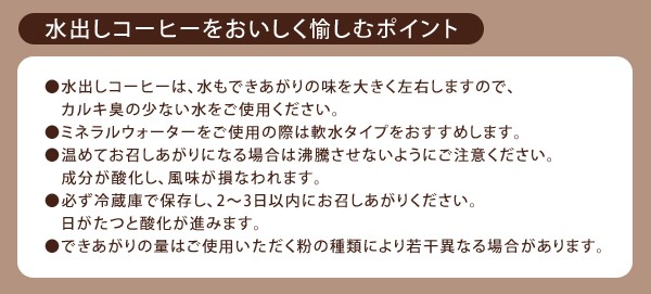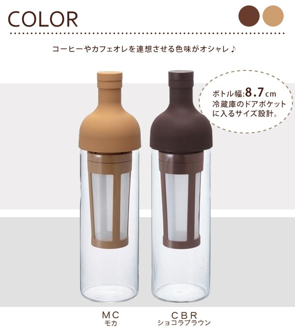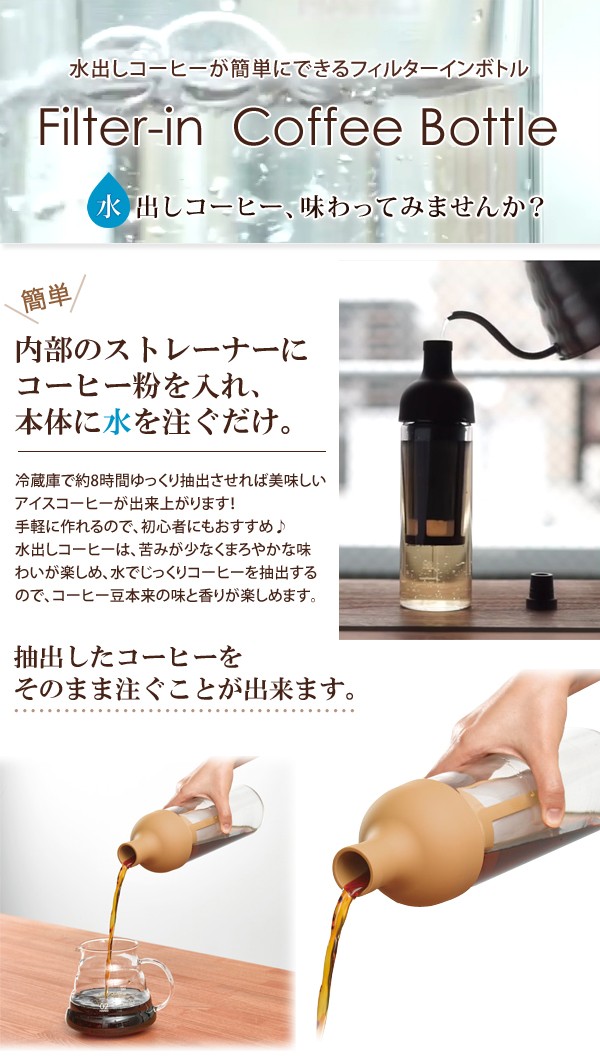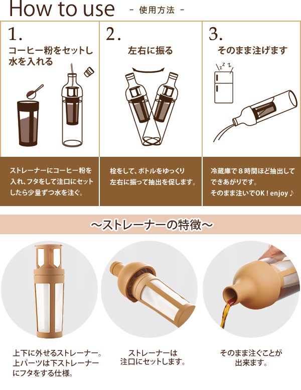 | <h1>内部のストレーナーにコーヒー粉を入れ、本体に水を注ぐだけ。冷蔵庫で8時間ゆっくりと抽出させれば美味しいアイスコーヒーが出来上がります!コーヒーやカフェオレを連想させる色味とワインボトルのような形がオシャレ♪</h1> |