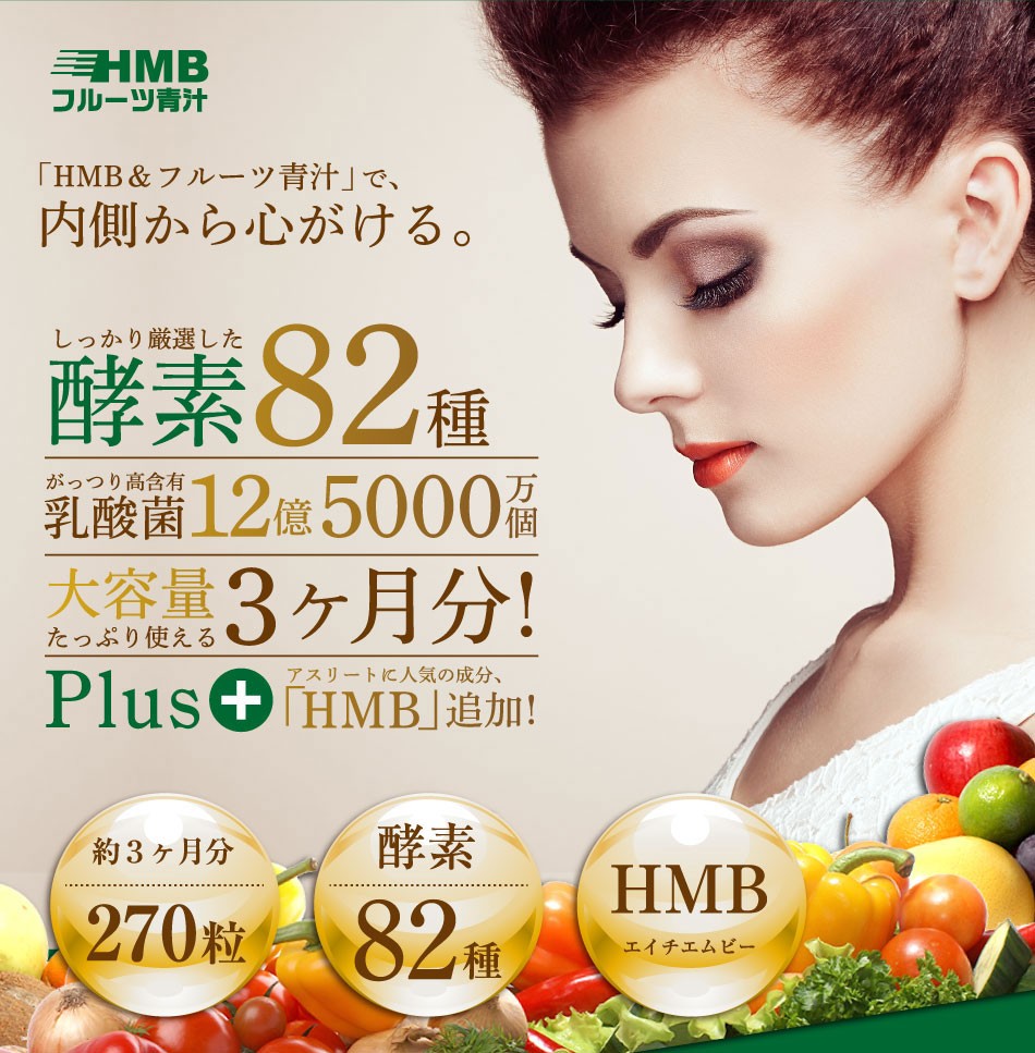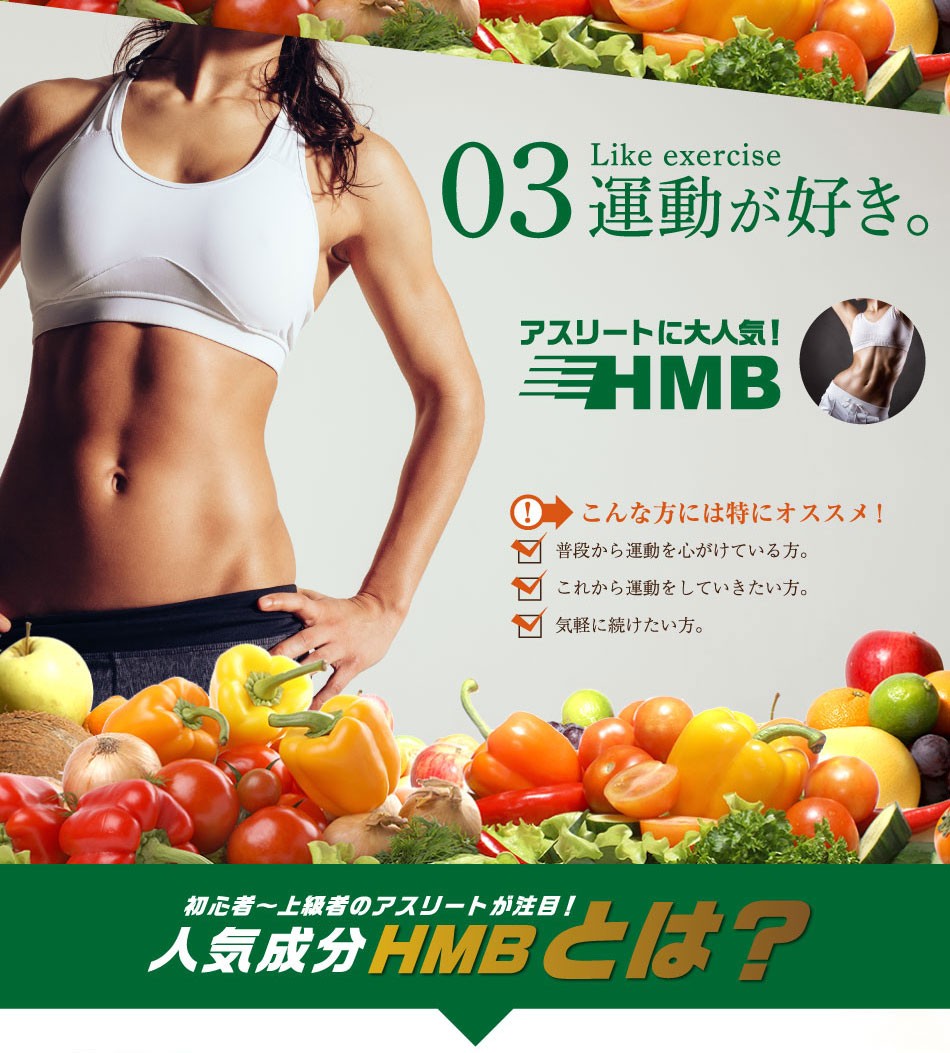 | 商品説明 | 今、注目されている「HMB」シリーズに新商品誕生! 筋肉サポートで人気の「HMB」に健康、美容サポートの大麦若葉や酵素を配合 |