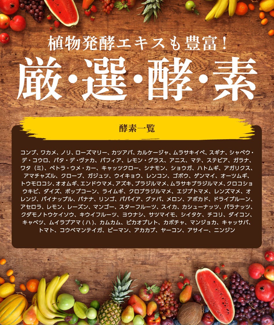 | 原材料名 | 大麦若葉末、マルチトール、HMBカルシウム、イソマルトオリゴ糖、抹茶粉末、ナタネ硬化油、混合果汁末、明日葉末、甘藷若葉末、植物発酵物(糖類、野菜類、野草類、果実類、キノコ類、穀類、海藻類 他)、水溶性食物繊維(難消化性デキストリン)、乳酸菌末(殺菌)、/結晶セルロース、微粒二酸化ケイ素、ステアリン酸カルシウム、香料、甘味料(アスパルテーム・L-フェニルアラニン化合物)、(原料の一部に乳成分、えび、かに、小麦、そば、落花生、オレンジ、カシューナッツ、キウイフルーツ、くるみ、ごま、大豆、バナナ、まつたけ、もも、やまいも、りんごを含む) |