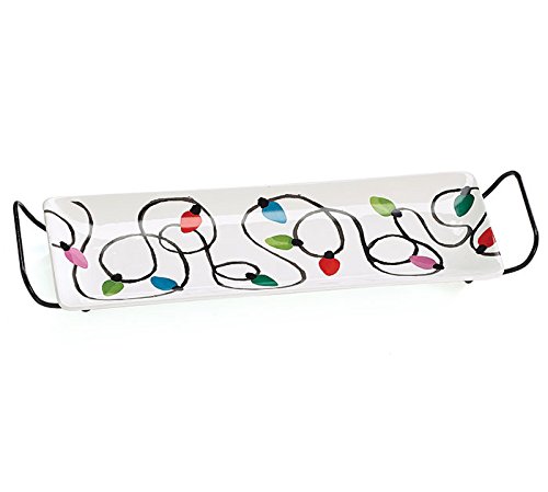 - White rectangle tray with an old fashioned multicolored Christmas light design that swirls all over the tray