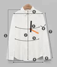 | 尺码 | ①前衣长 | ②后中长 | ③胸围 | ④下摆围 | ⑤腰围 | ⑥肩宽 | ⑦袖长 | ⑧袖臂围 | ⑨袖口围 | ||