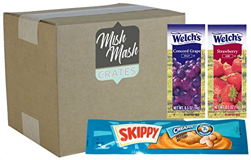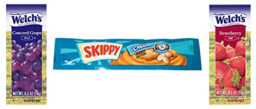 - PICNIC READY: Includes 20 Skippy Creamy Peanut Butter packs (1.12 oz.), 15 Welch's Strawberry Jams (0.5 oz.), and 15 Welch's Concord Grape Jellies (0.5 oz.) – total of 50 pieces