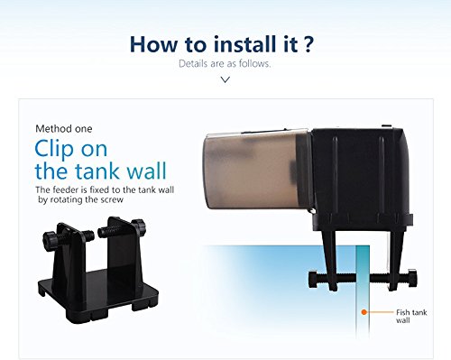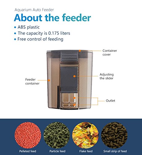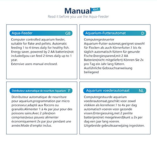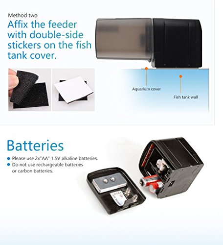 ♥ Automatic Fish Feeder Housing:Plastics? Mode: "M" button:Feeding time from 1 to 4 can be chosen bz this buttoon. ? ?" "button :After pressing the "SET" Abutton,the effected symbol (either hours or minutes) blinks respectively and it can be set to a higher number with " " button. "SET" button: After pressing the "MODE" button,"SET" button allows the respectively displayed times to be choosen. "Mode/Feed" button: Feeding time from 1 to 4 can be chosen by this button. BatteryType:2*AA batteries ♥Features? *Low Consumption,Brand news batteries can last more than 6 months for the ?Automatic Feeder in the normal working condition.? *The product combines the funcions of moistureproof and crush for foods.? *Can be Adjusted the capacity of feeding by setting the switch on the food container.? *Two Mode Optional,Once or twice feedings can be set within 1 day in the "M" Mode.Anytime's feeding can be done in the "M" Mode.? ♥ Operating Manner? *1. Loading 2 pics "AA" 1.5V Alkaline Batteries on the bottom of the machine? *2. Screw and fix the feeder on edge of tank by using the plastic screw or Stick the feeder on Suitable position on aquarium by sticking the two velcros on the bottom of the feeder.? *3. Time setting: As the picture shows ♥ Packing Included? 1 x Automatic Aquarium Fish Food Feeder 1 x Velcro? 1 x User manual 0 |