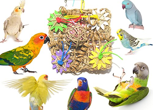 -. Feature : This bird toy is sure to be the center of any spoiled pet bird's home as it offers a multitude of textures to satisfy any pet's natural desire to play and shred. / This "activity wall" consists of vine mat that is covered in foam flowers, curly bamboo and poly rope. / The "heart" is a munch ball stuffed with crinkle paper. Stuffing your pet's favorite treats into the munch ball will turn this into a foraging toy. / Dimensions: 7.5" (long) x 7.5" (wide) x 3" (deep). Safe & non-toxic / Perfectly suited for birds as small as budgies up to the size of African Greys.