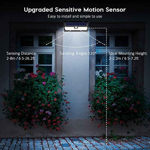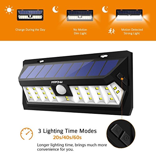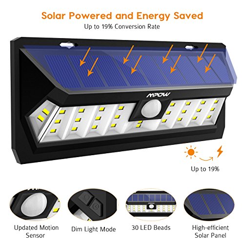 - Improved Illumination: compared with the most similar products on the market, Mpow solar light with 30 LED solar-powered bulbs is much brighter and powerful. Strong lighting emission brightens your way home. Upgraded ball head creates wider range illumination, detecting movements from 2 to 8meter at up to 120°.