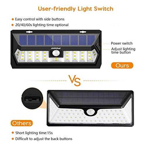 - User-friendly Light Switch: specially designed for easy control, unlike the similar LED solar lights on the market, our light’s switch is on the side instead of the back which helps you choose the motion sensor lighting time (20s/40s/60s) easily and fast.