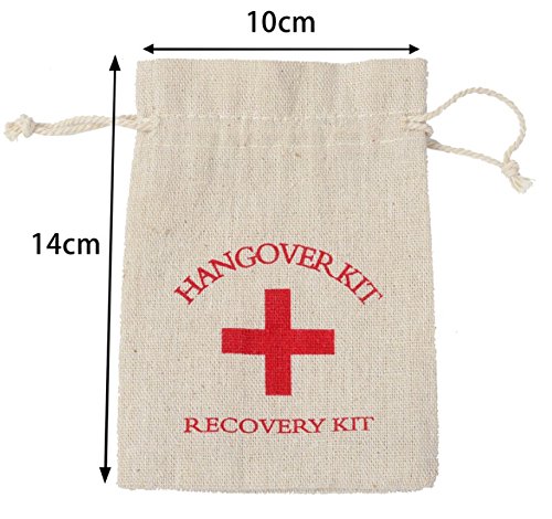 -. Feature : Packing list: 24pcs hangover kit bags 4 inch x 5.5 inch (10 x 14 cm) / Material: 100% high quality cotton muslin drawstring bag, no toxic chemicals used in weaving process of these bags with drawstring on both sides / Multipurpose Function: This natural muslin hangover kit bags are ideal for all kinds of party during this special seasoning, Christmas party, New Years eve, annual party etc. Give your friends and guests a leg up in hangover defense for the next morning by adding your favorite remedies like Advil, ear plugs, band aids, candy or breath mints. / Unique Design:Double beam mouth design, better and convenient than most products in market. / Durable and Reusable, Hand washing recommend.