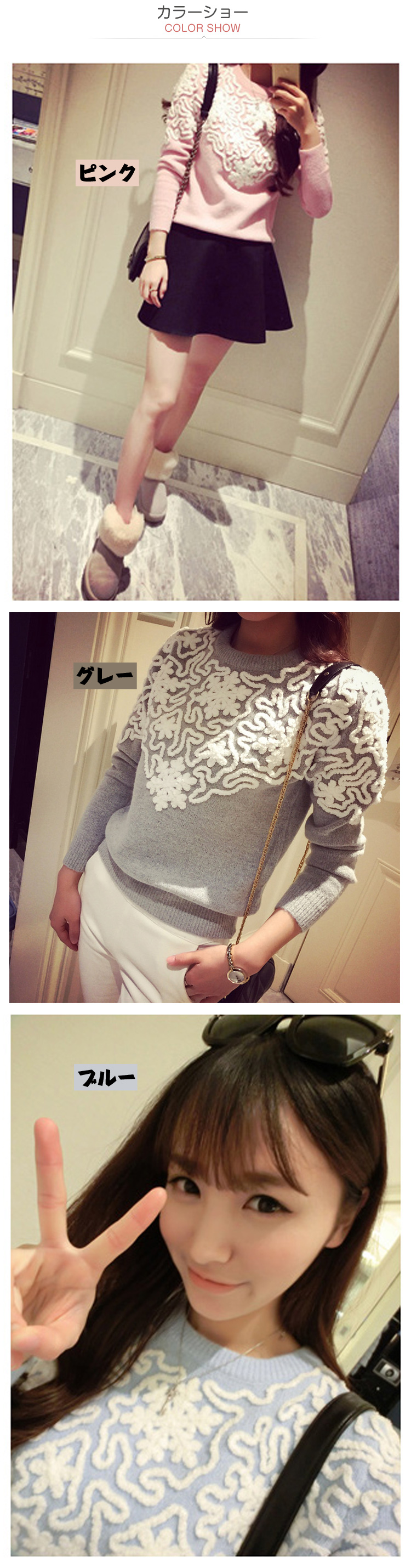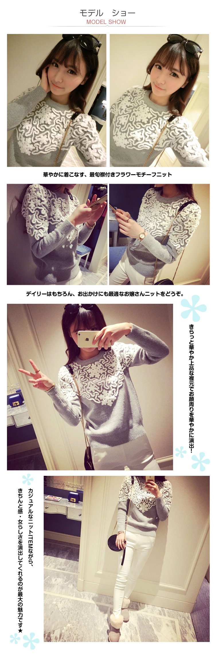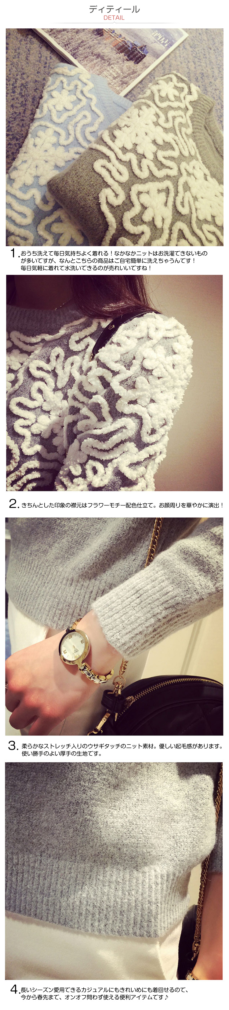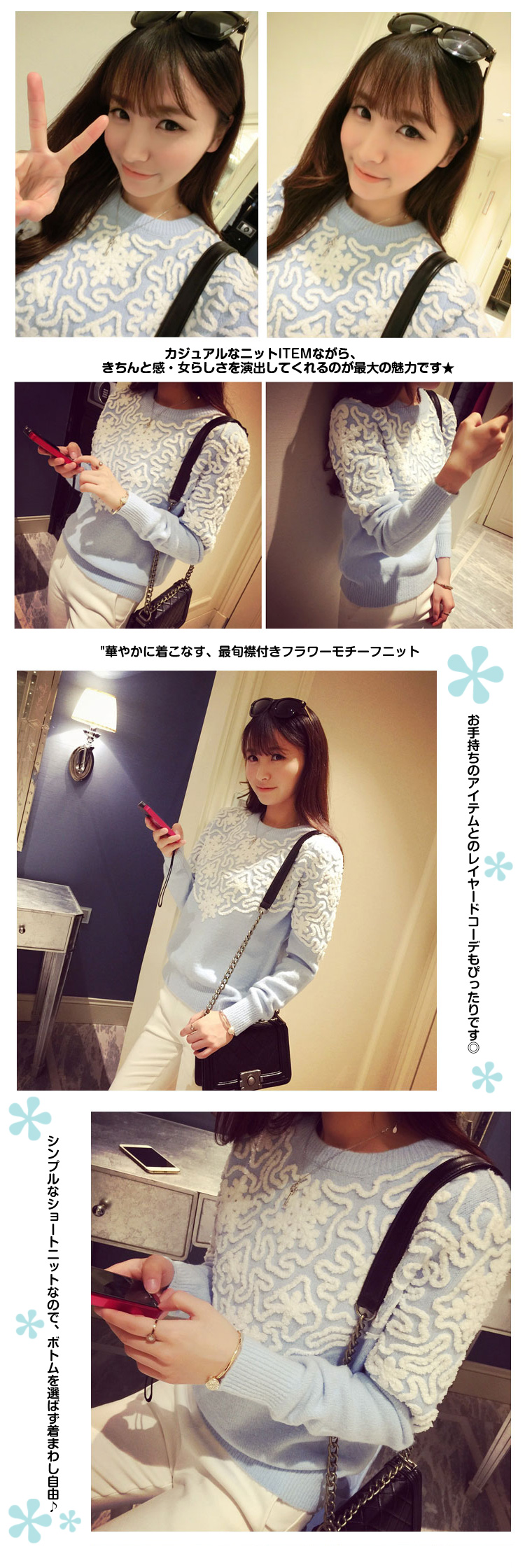 | 華やかに着こなす、最旬襟付きフラワーモチーフニット。デイリーはもちろん、お出かけにも最適なお嬢さんニットをどうぞ。きらっと華やか上品な襟元でお顔周りを華やかに演出!カジュアルなニットITEMながら、きちんと感?女らしさを演出してくれるのが最大の魅力です★シンプルなショートニットなので、ボトムを選ばず着まわし自由?お手持ちのアイテムとのレイヤードコーデもぴったりです◎ | |