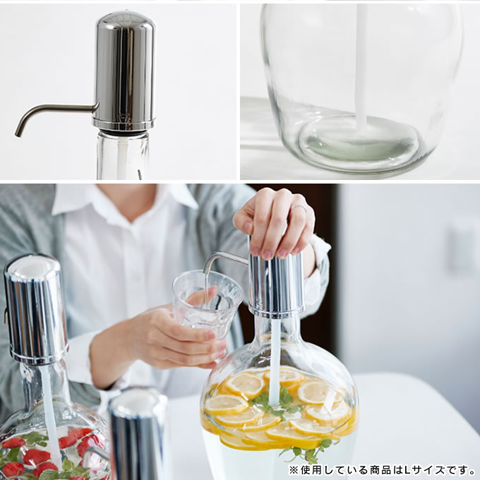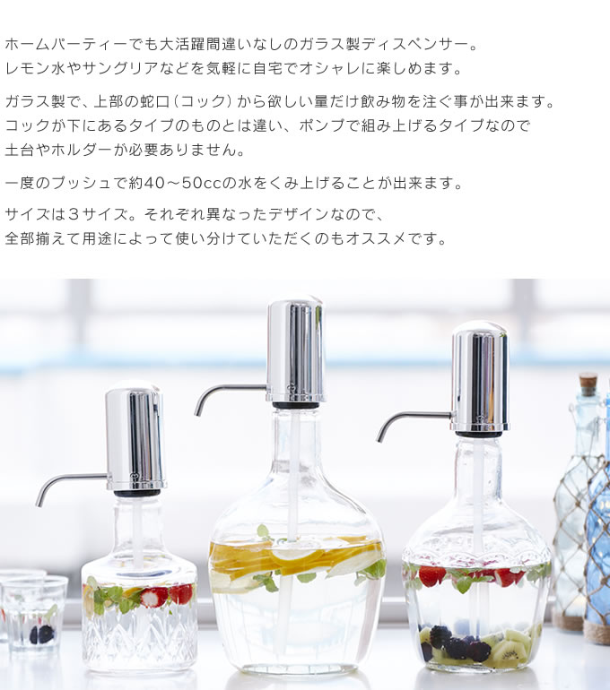 | ポイント | ホームパーティーなどでも大活躍間違いなしのガラス製ディスペンサー 蛇口(コック)が下にあるタイプのものと違い、ポンプで組み上げるタイプなので土台やホルダーが不要。 一度のプッシュで約40~50ccの水をくみ上げることが出来ます。 |