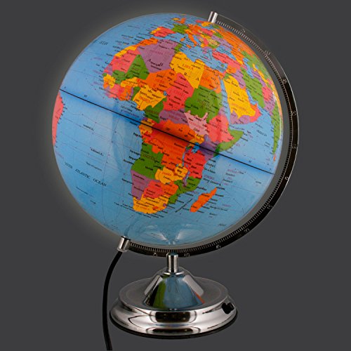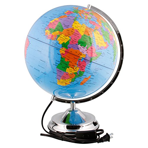 It features up-to-date cartography, vibrant blue oceans and colorful landmasses with political boundaries. The globe is held by a semi meridian mounted on a durable chrome plastic base. The globe is constructed from durable ABS Plastic Materials. Perfect for home, school, and office. Great for children adults of all ages.