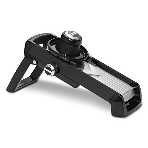 -. Binding : Kitchen -. Brand : KitchenAid -. Color : Black -. EAN : 0024131167623 -. Feature : This New & Improved Mandoline Slicer is perfect for making precise straight slices and julienne strips, in 5 different thicknesses / The slicing table and cutting blades are made from cutlery-grade stainless steel and are resistant to rusting / The oversized food pusher can accommodate larger fruits and vegetables and will protect your fingers while slicing / Includes a protective sheath for each blade for safe storage / Rear leg folds inside the body and the extra blade and food pusher can be stored under cutting table for compact storage; One year hassle-free replacement and lifetime limited warranty -. IsAdultProduct : 0 -. Label : Kitchenaid -. Manufacturer : Kitchenaid -. Model : KN310BXOBA -. MPN : KN310BXOBA -. PackageQuantity : 1 -. PartNumber : KN310BXOBA -. ProductGroup : Kitchen -. ProductTypeName : KITCHEN -. Publisher : Kitchenaid -. Studio : Kitchenaid -. Title : KitchenAid Gourmet Mandoline Slicer, Black -. UPC : 024131167623 -. Warranty : Limited lifetime warranty