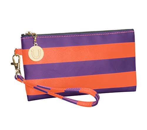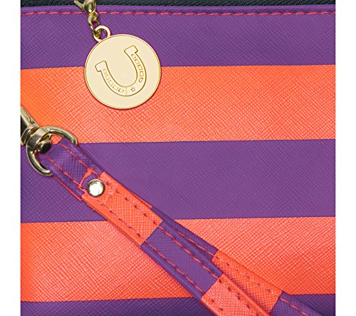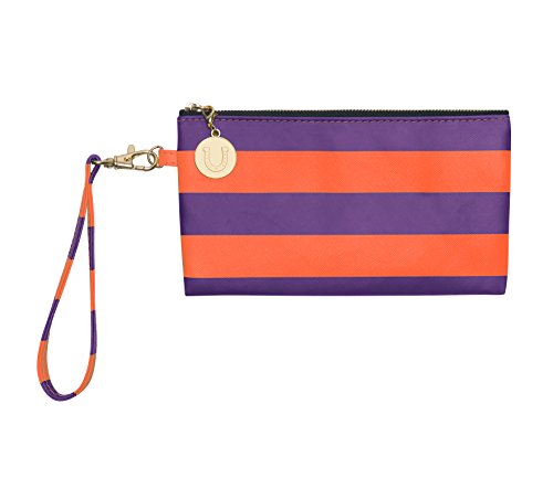 Product Description With this colorful and versatile purple orange striped wristlet, you can use as a clutch or remove the wrist strap and use as a makeup bag inside your favorite tote. Cute and clever, these purple and orange stripes make the statement, while the charm provides the punctuation. 0