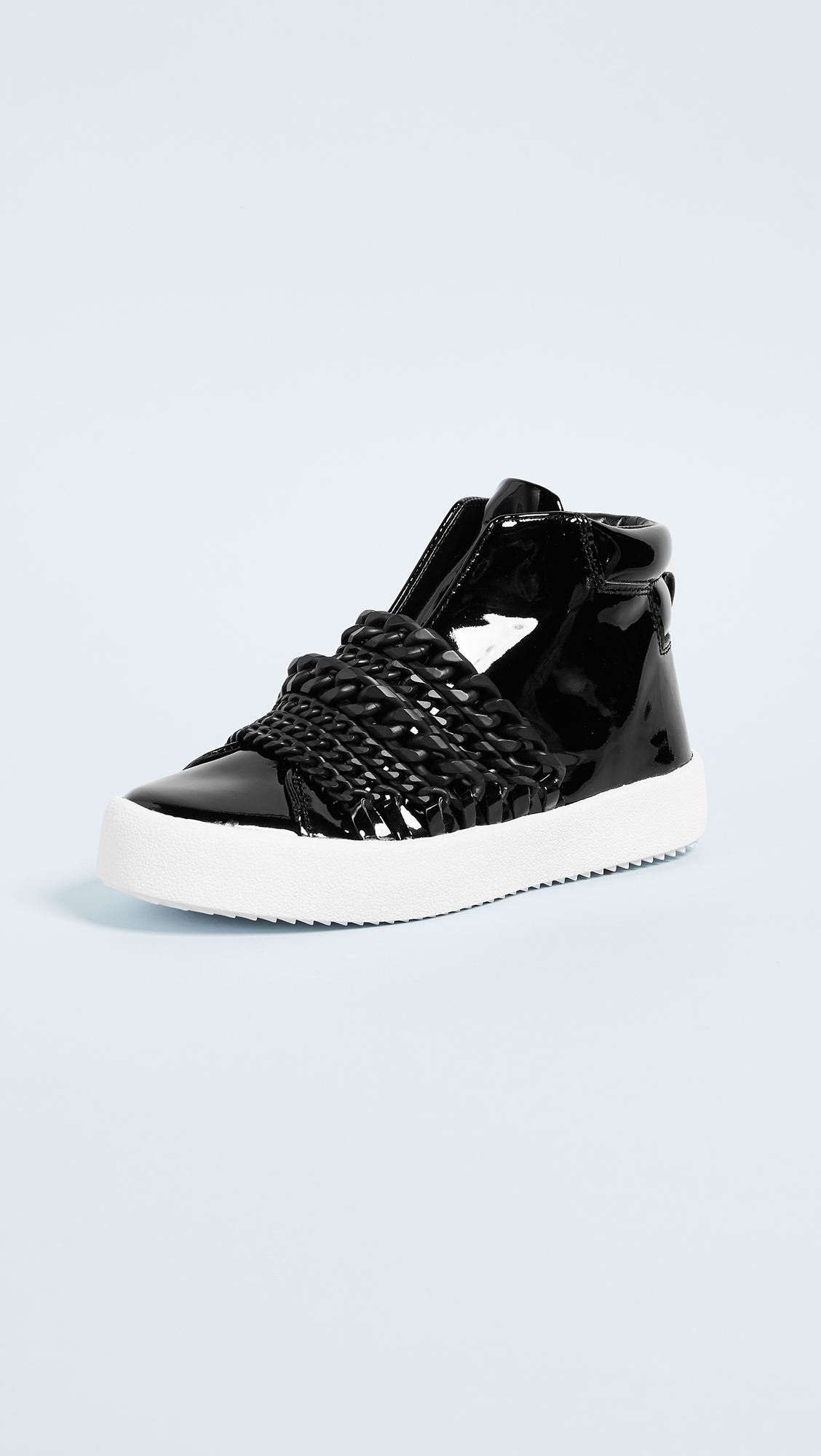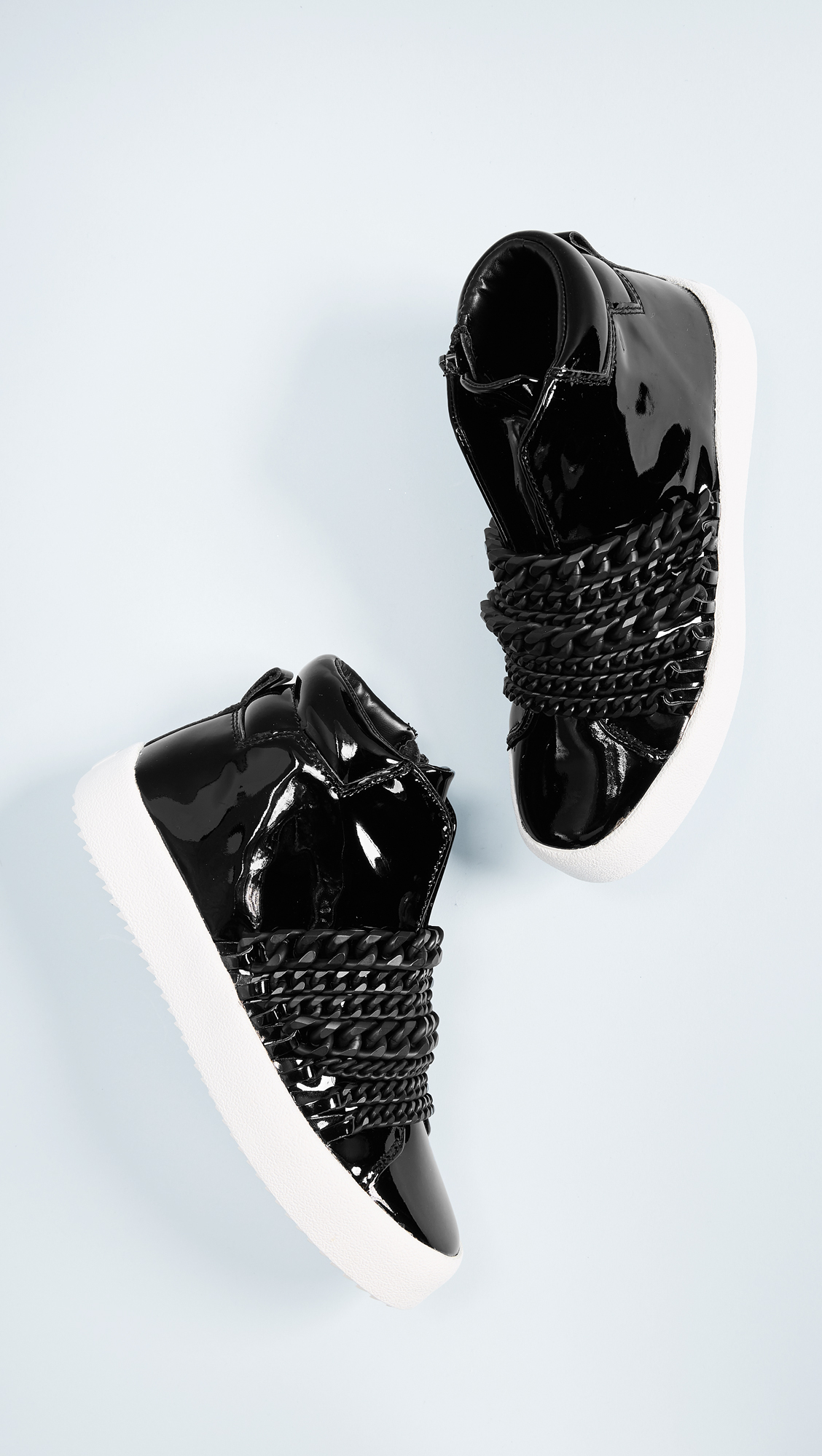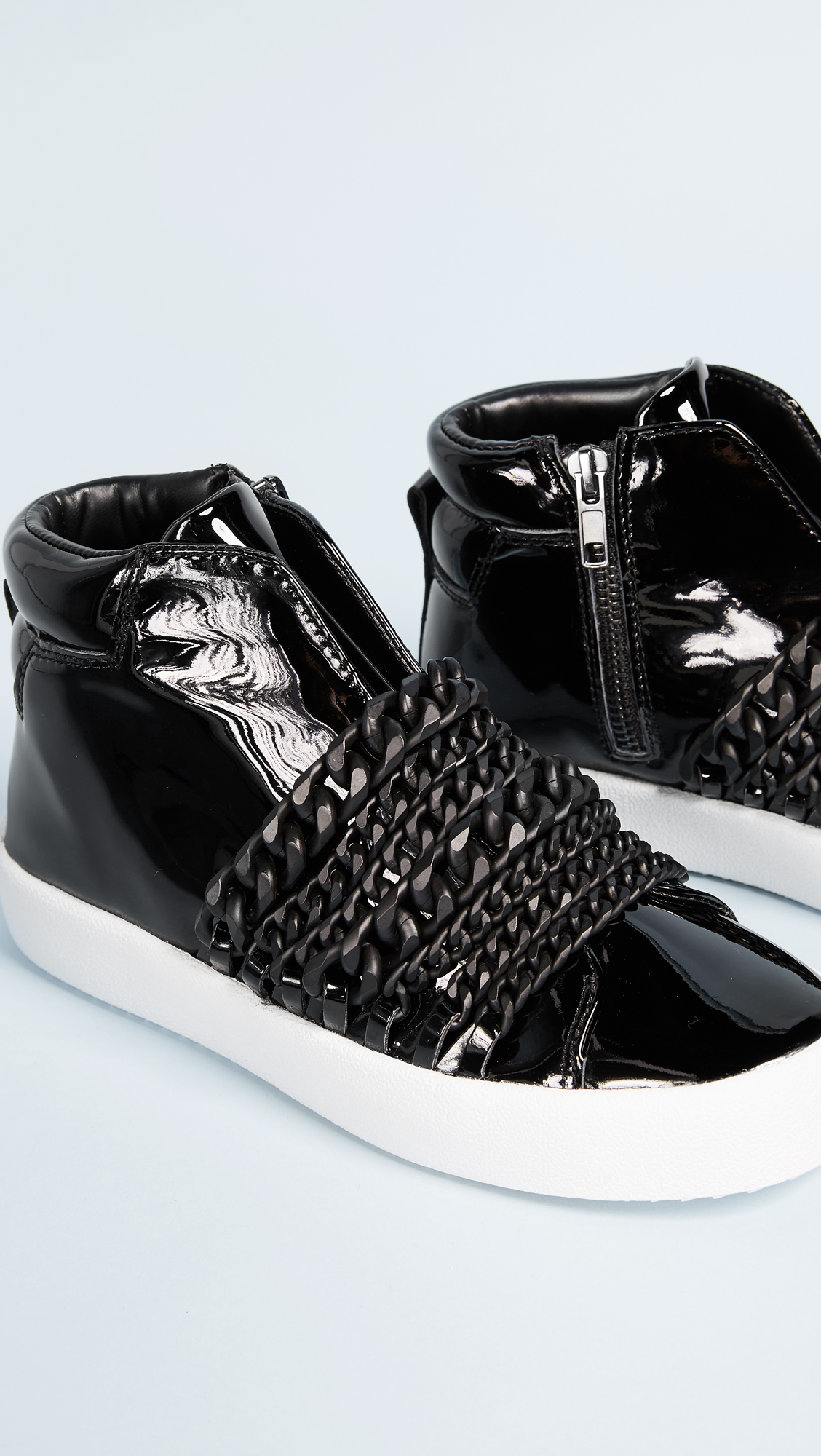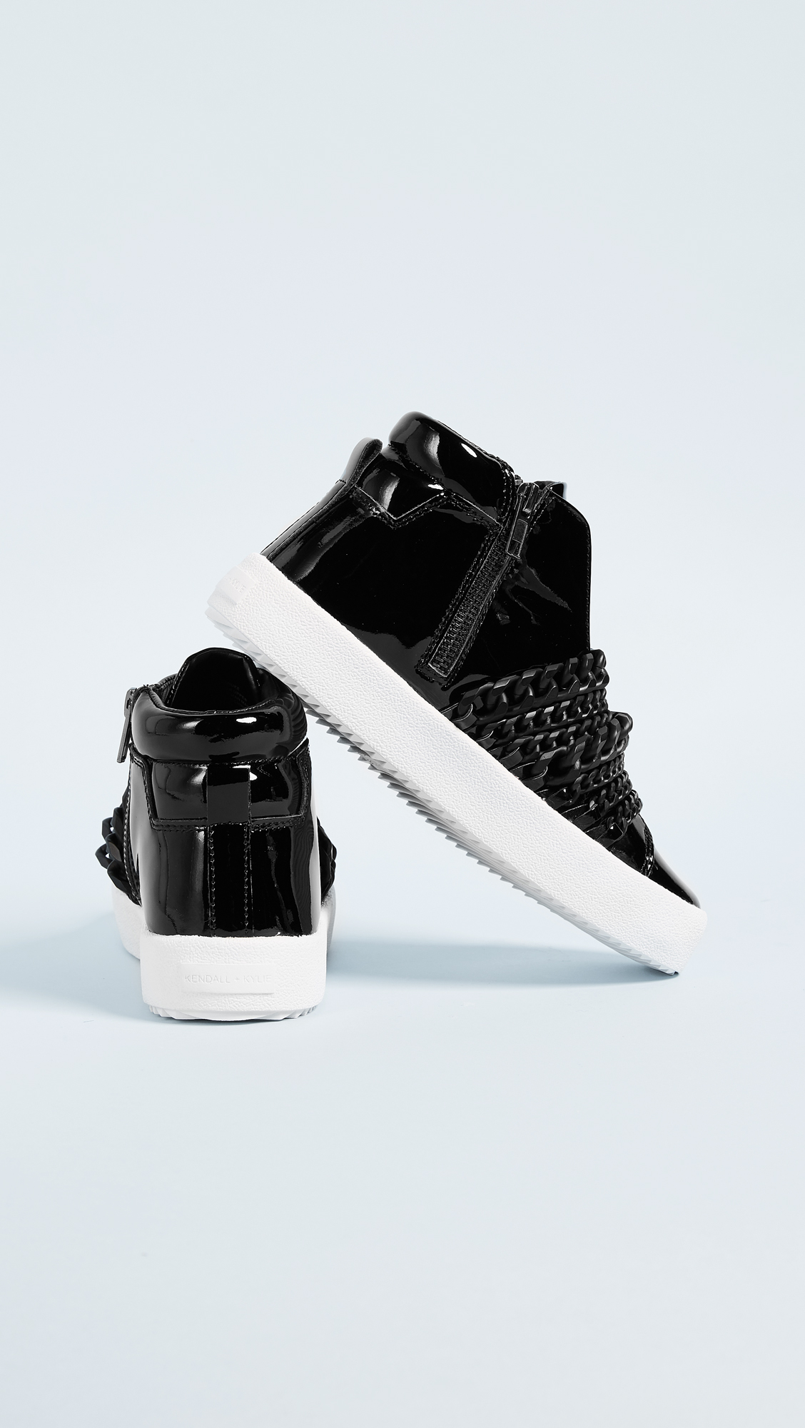 Tonal chains add a subtle edge to these sporty KENDALL KYLIE high-top sneakers. Hidden elastic straps and exposed side zip. Textured platform and rubber sole.