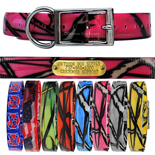 Studio : Outdoor Dog Supply Publisher : Outdoor Dog Supply Binding : Misc. Product Description These collars are extremely durable and have a tight hole spacing in order to get the best fit on your dog. It has a heavy duty D ring near the buckle. The 19" Long fits dogs with a neck size of 11" to 19" . The overall length of the collar is 21". The 21" Long fits dogs with a neck size of 14" to 21" . The overall length of the collar is 23". Comes with a free custom brass name plate, you get three lines of text: Line 1- 18 characters, including spaces. Line 2- 16 characters, including spaces. Line 3- 18 characters, including spaces. Please email us your tag information within 48 hours of placing your order or call to give us the tag information. If no tag information is received we will ship your collar with no tag included. Please note we cannot stamp email addresses on tags. If the information you provide exceeds the spacing limitations stated, we will revise your information to include as much information as possible from what you provided. Due to the high volume of customized name tag collars we sell and shipping time requirements, we are not able to contact buyers for tag revisions that exceed the spacing limitations. Thank you! **We have the Southern Flag collar available, but due to Amazons policy we are not allowed to sell it here. Please visit our website to purchase this collar.** 0