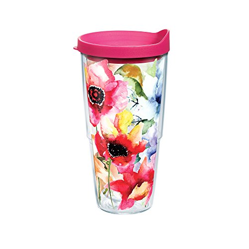 Tervis Watercolor Blooms Wrap Tumbler with Fuchsia Lid, 24 oz, Clear