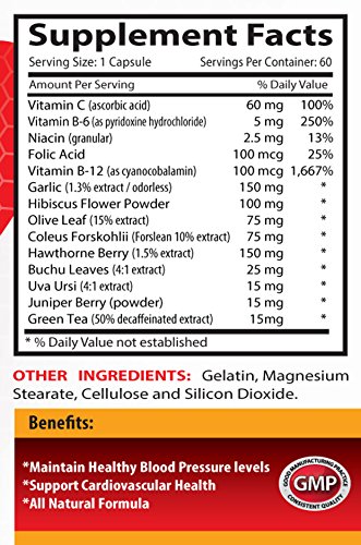 -. Feature : Buchu leaf extract - BLOOD PRESSURE SUPPORT - improve blood vessels (1 Bottle): This natural Blood pressure support supplement may be beneficial to the body in lowering blood pressure. Our natural supplement has the unique blend of herbs, vitamins and minerals that may show its benefits in dealing with blood pressure. Among those ingredients are: garlic, hibiscus flower powder, olive leaf, hawthorne berry, green tea, vitamin B and C. / BENEFICIAL FOR WEIGHT LOSS: Uva-ursi leaf as one of the components of this herbal blood pressure support supplement may be beneficial for weight loss. This natural supplement may be useful in controlling water weight that won't easily come off. Although uva-ursi may be useful within an overall weight that may be beneficial for blood pressure support as well. / BENEFICIAL FOR BLOOD PRESSURE: Forskolin from coleus as one of the ingredients of our herbal blood pressure support may be useful in dealing with blood pressure as well as supporting the muscles found in blood vessels. may also shows it beneficial properties on cardiovascular health. Our natural blood pressure support supplement may be beneficial for blood pressure control as well as promote overall well being. / ANTIOXIDANT PROPERTIES: Obtaining antioxidant properties or natural blood pressure supplement may be useful for promoting overall health and supporting blood vessels. Juniper berries as one of the components of this supplement may show antioxidant benefits and promote well being. Hawthorn another component of supplement may also be an active compound with antioxidant properties. Those antioxidants may be useful for dealing with ageing process. / BLOOD PRESSURE SUPPORT - Each bottle - 60 capsules - all natural Non-GMO, Gluten-Free formula to support blood vessel and help lose weight, maintain blood circulation, control blood pressure and maintain blood flow, support of cardiovascular health. Made in USA. Scientifically standartirized to the highest level of our active P.R.Inciples. 30-day 100% money-back guaranteed.