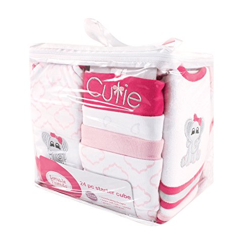 Luvable Friends 24 piece gift cube is a great set of baby clothes for any newborn. Each set includes 5 bodysuits, 2 sleep and plays, 1 tee top, 2 pairs of pants, 3 caps, 3 pairs of scratch mittens, 2 blankets, 6 bibs and a reusable vinyl bag. All pieces of the set are designed to look great together to make dressing your little one nicely as easy as possible. Made of super soft cotton the set is designed to fit babies up to 6 months old. The perfect baby gift all in oneFeature