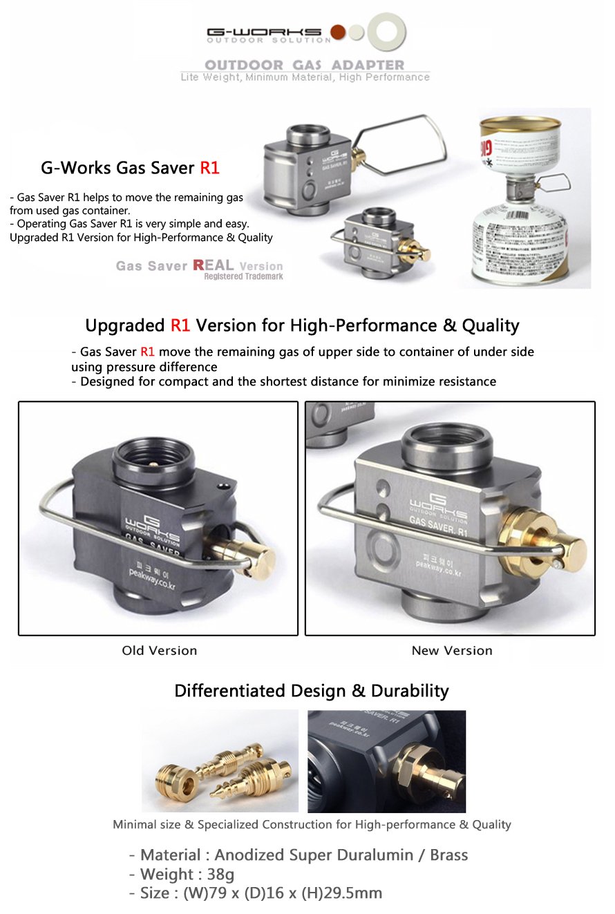 Model : 1EA gas saver R1 (Not included another adapter) Material : Anodized Super Duralumin / Brass Weight : 38g Size : (W)50 x (D)16 x (H)29.5mm